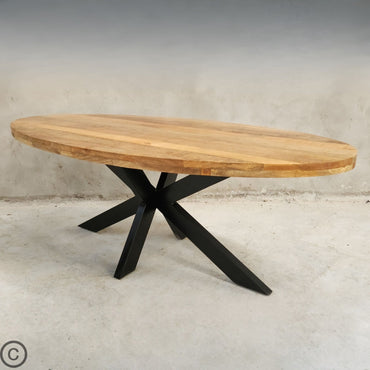 La table industrielle ovale Kukuu est le parfait mélange entre style moderne et design industriel. → Plateau entièrement en manguier massif → Fabriqué à la main...