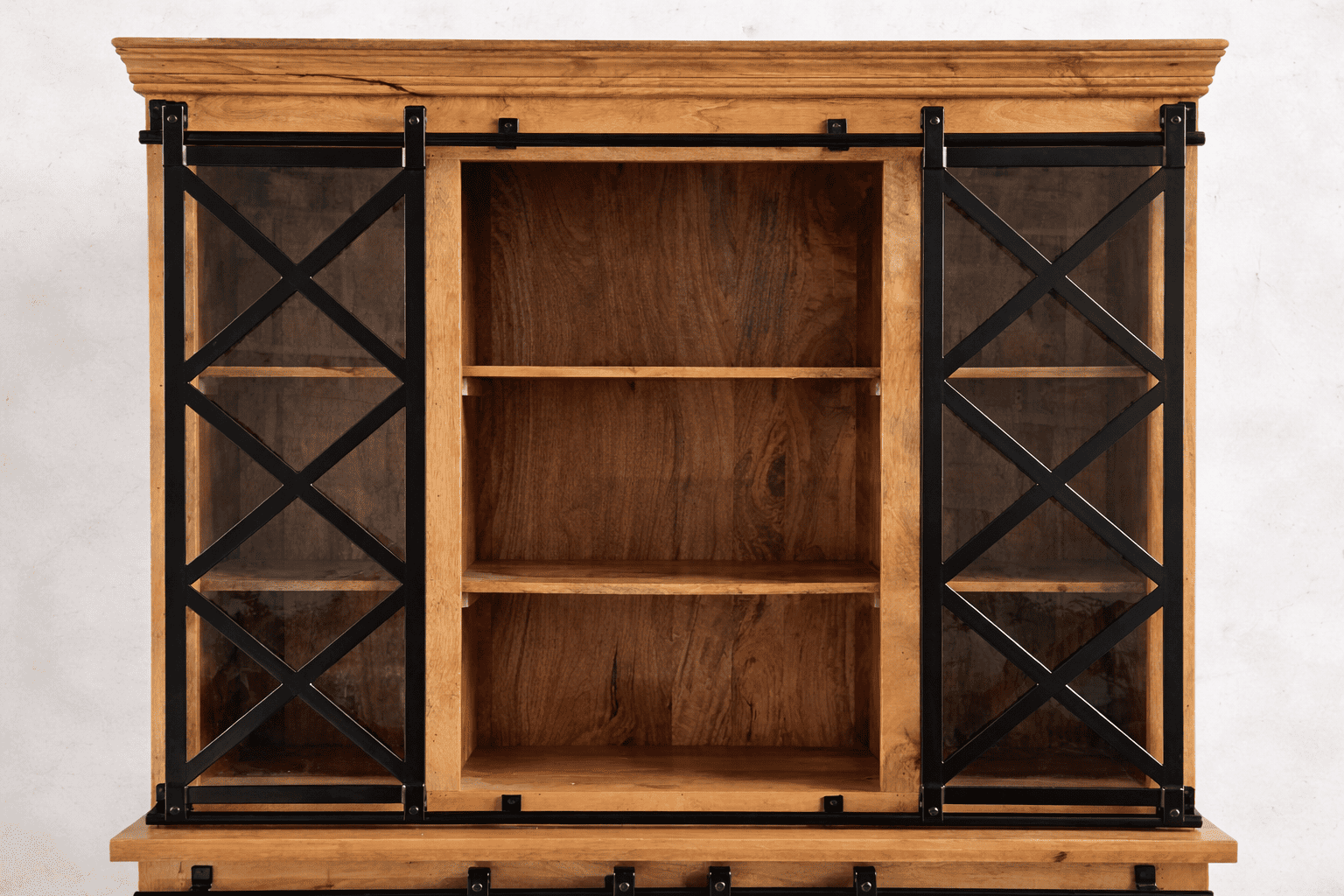 Ce modèle allie esthétique industrielle et fonctionnalité grâce à ses nombreux rangements : étagères ouvertes, vitrines et tiroirs spacieux. Un meuble aussi pratique que décoratif, idéal pour organiser votre vaisselle tout en sublimant votre intérieur.